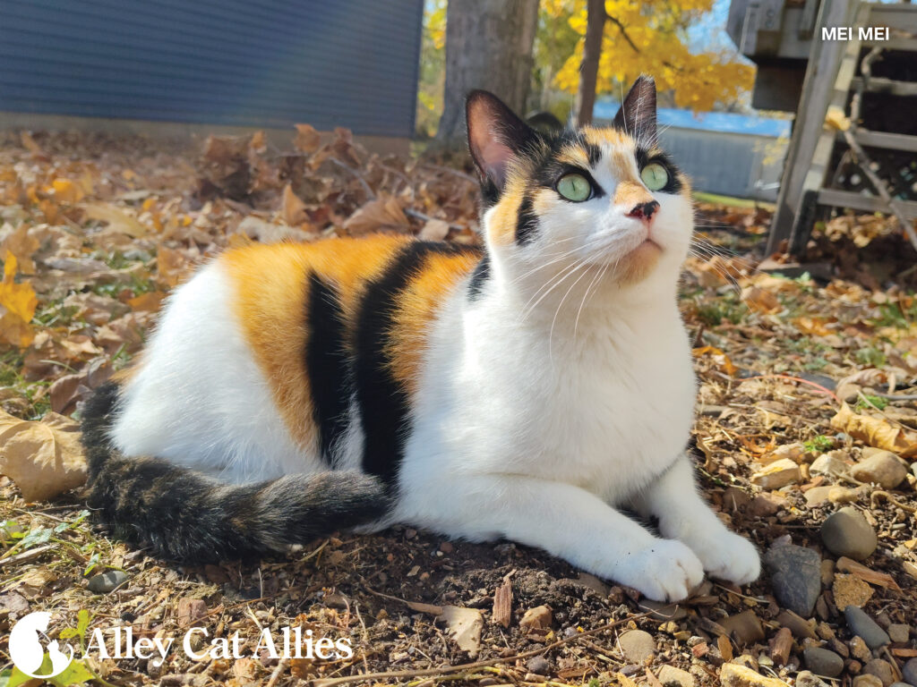 Mei Mei is one of several community cats her caregiver, Peter, has spayed or neutered through Trap-Neuter-Return (TNR) over the years! She stands out for her fiery temper, but also for her sweet, loyal side. Once she’s bonded to her caregivers or another cat, she’ll happily share her food and indulge in some grooming!