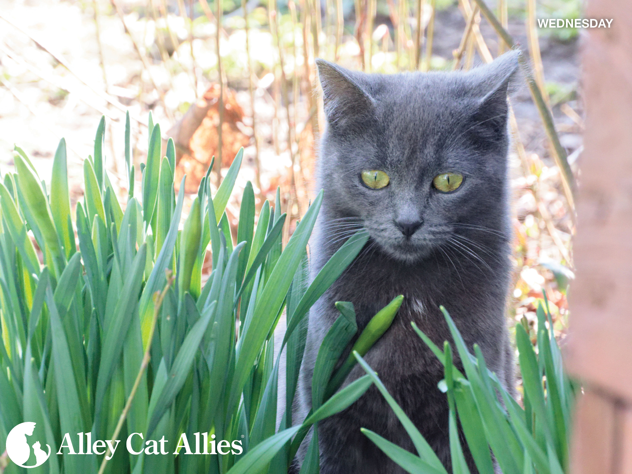 Wednesday is the youngest of several community cats living in Joel’s yard. She and her feline family have all been spayed or neutered through a TNR program and made their home outdoors next to Joel’s. The curious type, Wednesday likes to follow her caregivers when they’re out and about in the yard.