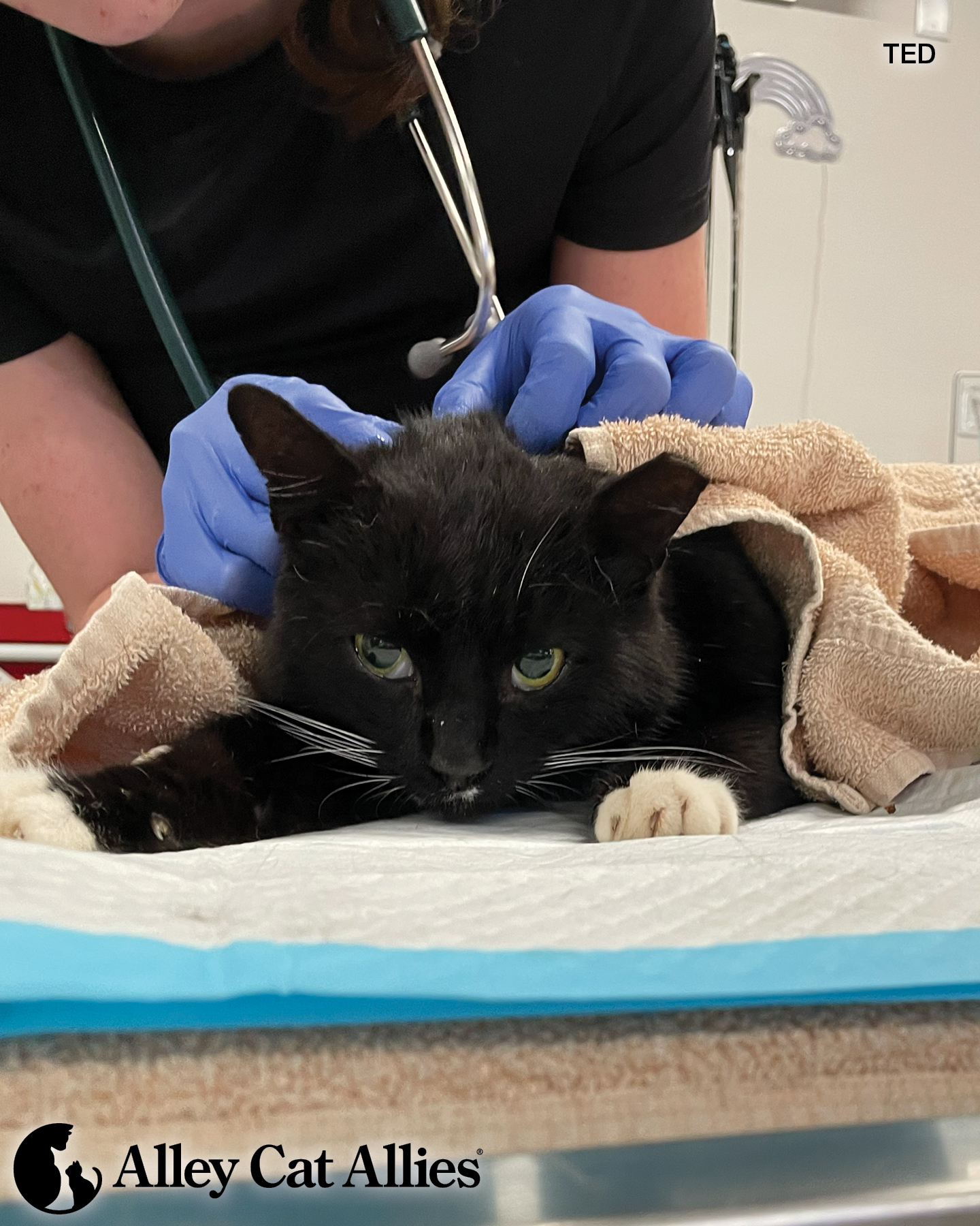 Teddy is an easygoing guy, so he could be safely handled during his exam. However, we recommend always bringing a community cat to the veterinarian in a humane trap. We have a full guide on how to help sick or injured cats outdoors here.