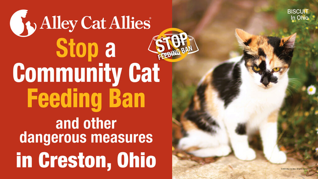 On Monday, December 22, the Village of Creston, Ohio, will consider two cruel ordinances that would put cats’ lives in danger. Alley Cat Allies has condemned the measures and will pursue further action to stop them if necessary. We’ll keep you updated on how you can act with us.