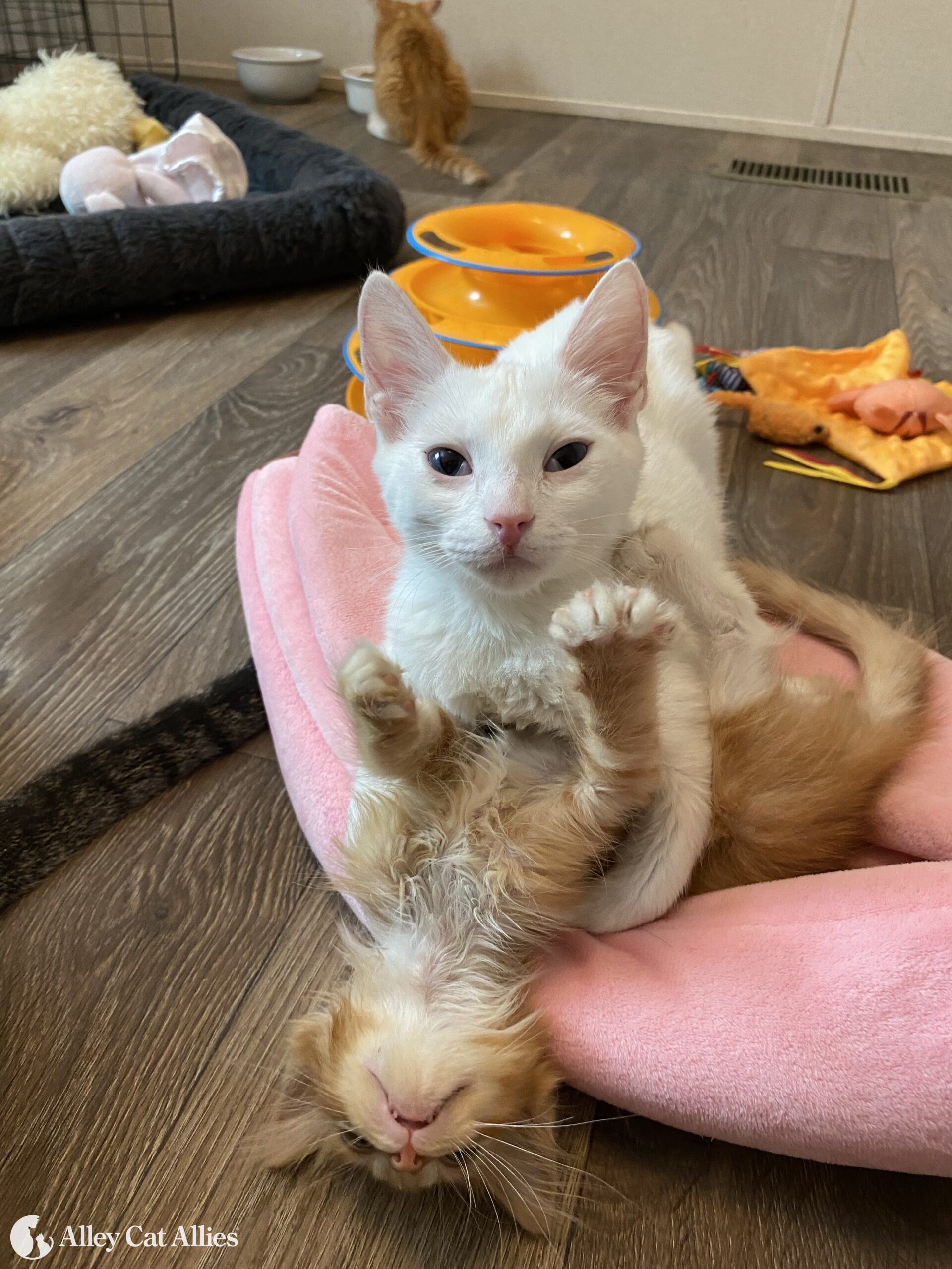 You know kittens are feeling better when they seek out new playmates! Alfredo (named for his coat, of course) is getting healthier and stronger every day thanks to treatment covered by Alley Cat Allies’ veterinary grant in Arkansas.