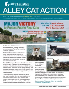 ALLEY CAT ACTION® Alley Cat Allies Newsletter | alleycat.org | Fall 2024 For Alley Cat Allies’ More Than 1.4 Million Supporters and Activists Across the Nation and Around the World Follow us on social media! /AlleyCatAllies If not for Alley Cat Allies and our supporters like you, a deadly removal of community cats in Puerto Rico would be underway right now. The United States National Park Service (NPS), which announced intention to eradicate cats from the San Juan National Historic Site late last year, planned to start ripping cats from their outdoor homes as early as October 1, 2024. Alley Cat Allies’ legal efforts and refusal to back down forced the NPS to agree to halt all movement on its cruel plan until a federal court decision in 2025. Cats like Bella, Mufasina, and Llorin are still eating, sleeping, and playing amid the surf-swept rocks of their outdoor home because of our action—and our supporters like you who make it possible. Other organizations believed affecting the NPS’s plan wasn’t possible. Alley Cat Allies has faced the “impossible” before. Once upon a time in 1990, humane programs for cats like Trap-Neuter-Return (TNR) were considered impossible, too. We made our name by proving otherwise and launching TNR into MAJOR VICTORY to Protect Puerto Rico Cats We didn’t back down, so the U.S. National Park Service did the mainstream in the U.S. and worldwide. Now, after launching a historic federal lawsuit against the NPS and celebrating our latest victory, we continue our fight until the NPS abandons its inhumane and illegal plan permanently, and community cats in Puerto Rico are protected and supported as the community members they are. These cats’ future still hangs in the balance. Learn more and share our victory far and wide at alleycat.org/PuertoRico. BELLA MUFASINA LLORIN WATCH: Fighting Deadly NPS Plan to Remove Puerto Rico Cats