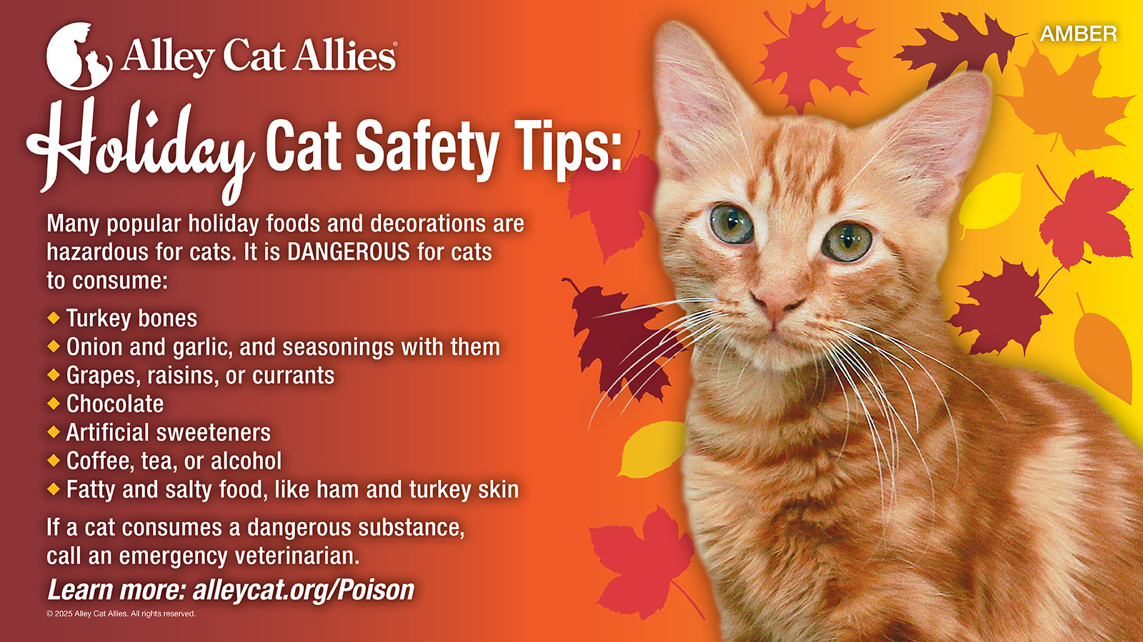 With all the family gatherings and hearty meals upcoming, Alley Cat Allies wants to ensure cats and kittens have a safe and happy holiday season as well. That means taking precautions so they don’t ingest food that is harmful and even toxic to them.