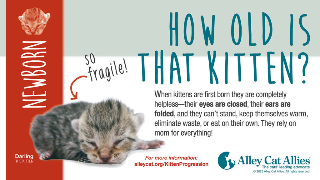 Kittens have unique needs at every stage of life that their mother is best able to provide, and Alley Cat Allies educates advocates around the world to Leave Them Be if kittens and their mother cat are together outdoors. But if you find a young kitten who is orphaned and needs help, our popular How Old Is That Kitten? resource will help you determine their age and the best steps to take to care for them.