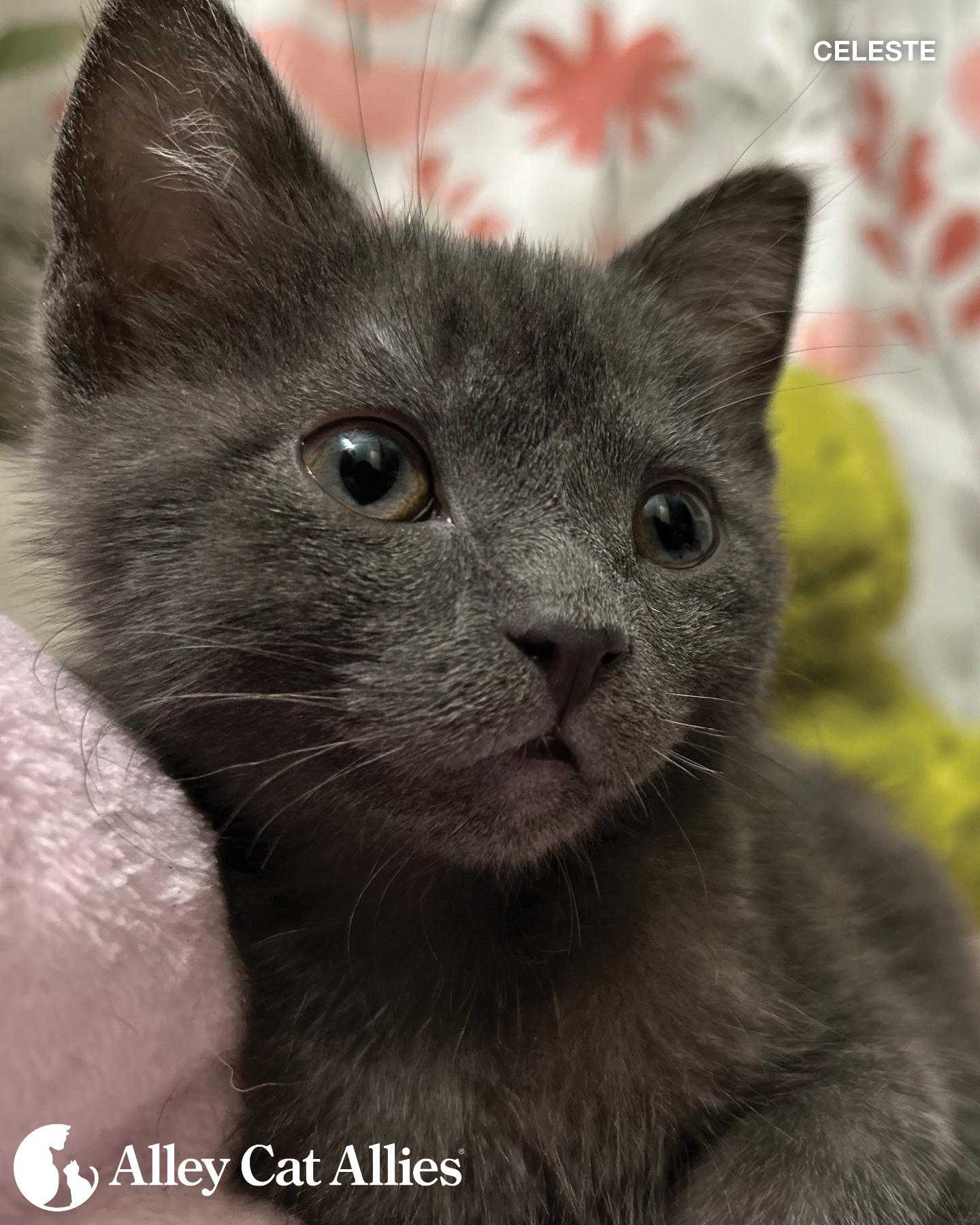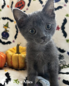 Celeste, who’s just over 8 weeks old, was rescued when she was dehydrated and massively underweight. Though she had so much working against her, she’s a fighter—and has made an incredible recovery under expert veterinary treatment. Alley Cat Allies is covering the costs of her care, and she’s gaining healthy weight—and so much personality—every day. We’re glad to say she’s a happy, playful kitten despite it all.