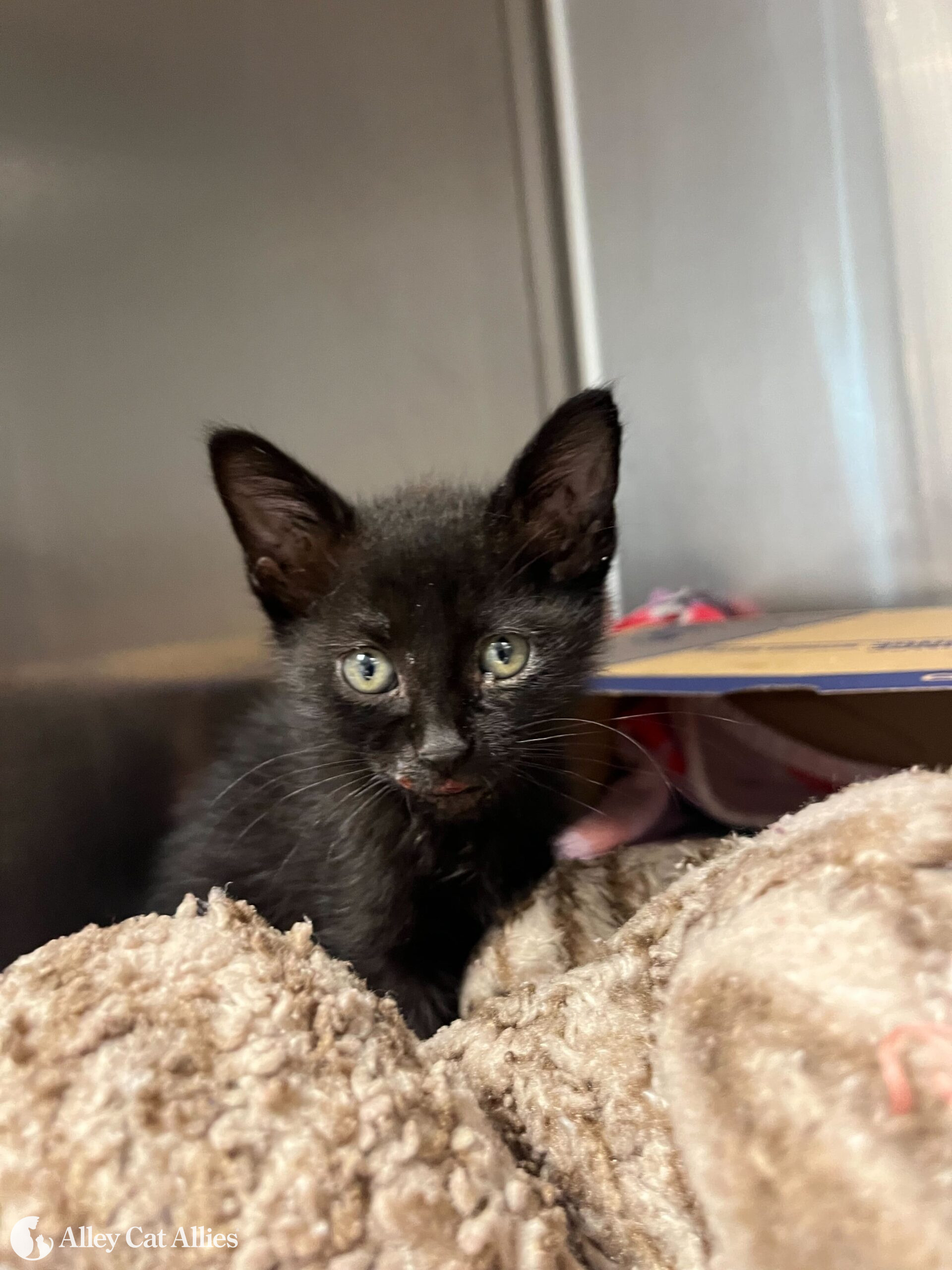 Many of the cats and kittens who were transferred were at risk of “euthanasia” in the shelter had we not stepped in. Little grey fluffball Leroy, just three weeks old, needed round-the-clock care like every kitten his age, and had wounds on his legs in need of treatment. Alley Cat Allies is covering the costs of his care and he will be placed for adoption once he’s old enough to be neutered.